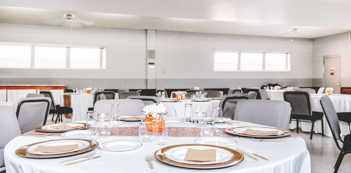 Each rental space includes tables and chairs. The Gym can host up to 250 guests and features a stage, private bathrooms, and high ceilings. The Cafeteria offers a cozier setting for up to 100 guests and includes a private bathroom and kitchen for warming and serving catered or prepared food.
